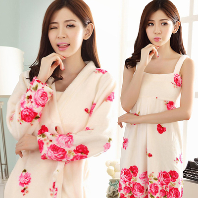 韩版睡衣女冬季珊瑚绒睡裙长袖加厚法兰绒睡袍两件套浴袍家居服秋