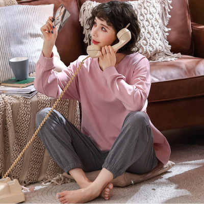 睡衣女秋冬长袖睡衣套装纯色简约精梳棉少女士潮流家居服套装女秋